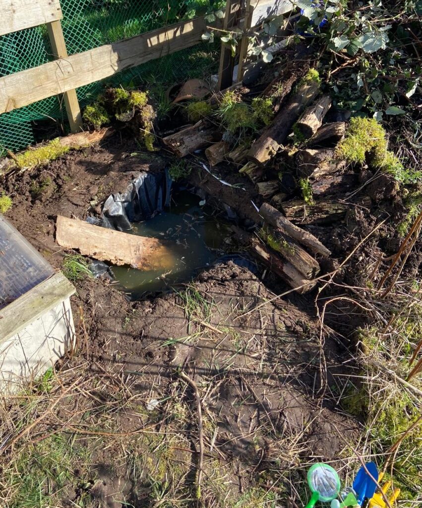 However, this pond was too un-protected from sunlight and did not have a natural corridor for animals to risk the journey to the pond. The water levels have dropped despite rain and only a few micro organisms can be seen swimming the water…I have also learnt that these plastic bucket pond liners contain a sheer drop and can trap animals inside the pond and due to the smooth plastic surface, plants will struggle to plant their roots.